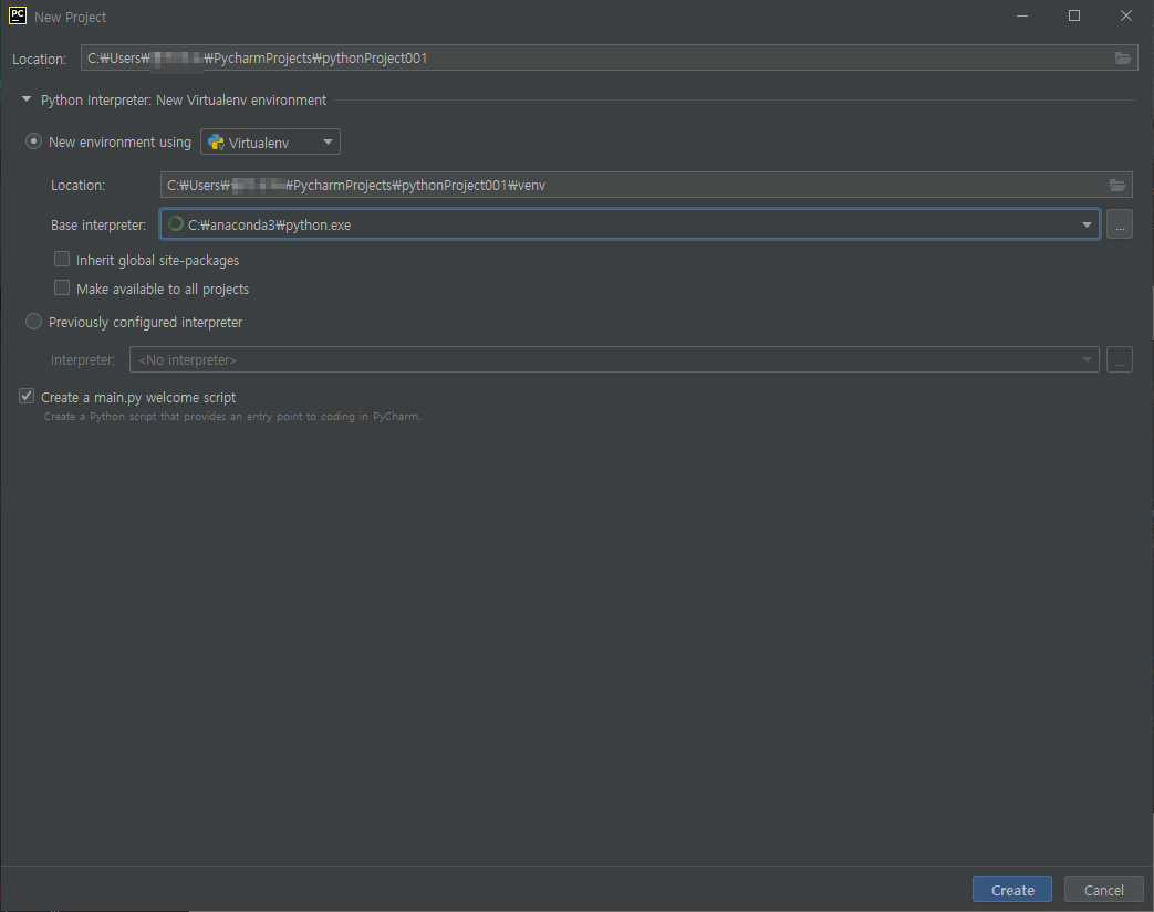 파이참과 아나콘다를 연동시키기 위해서는 파이참에서 새 프로젝트를 열고 기본 인터프리터를 아나콘다에 있는 파이썬 실행파일로 선택해 주어야 한다.