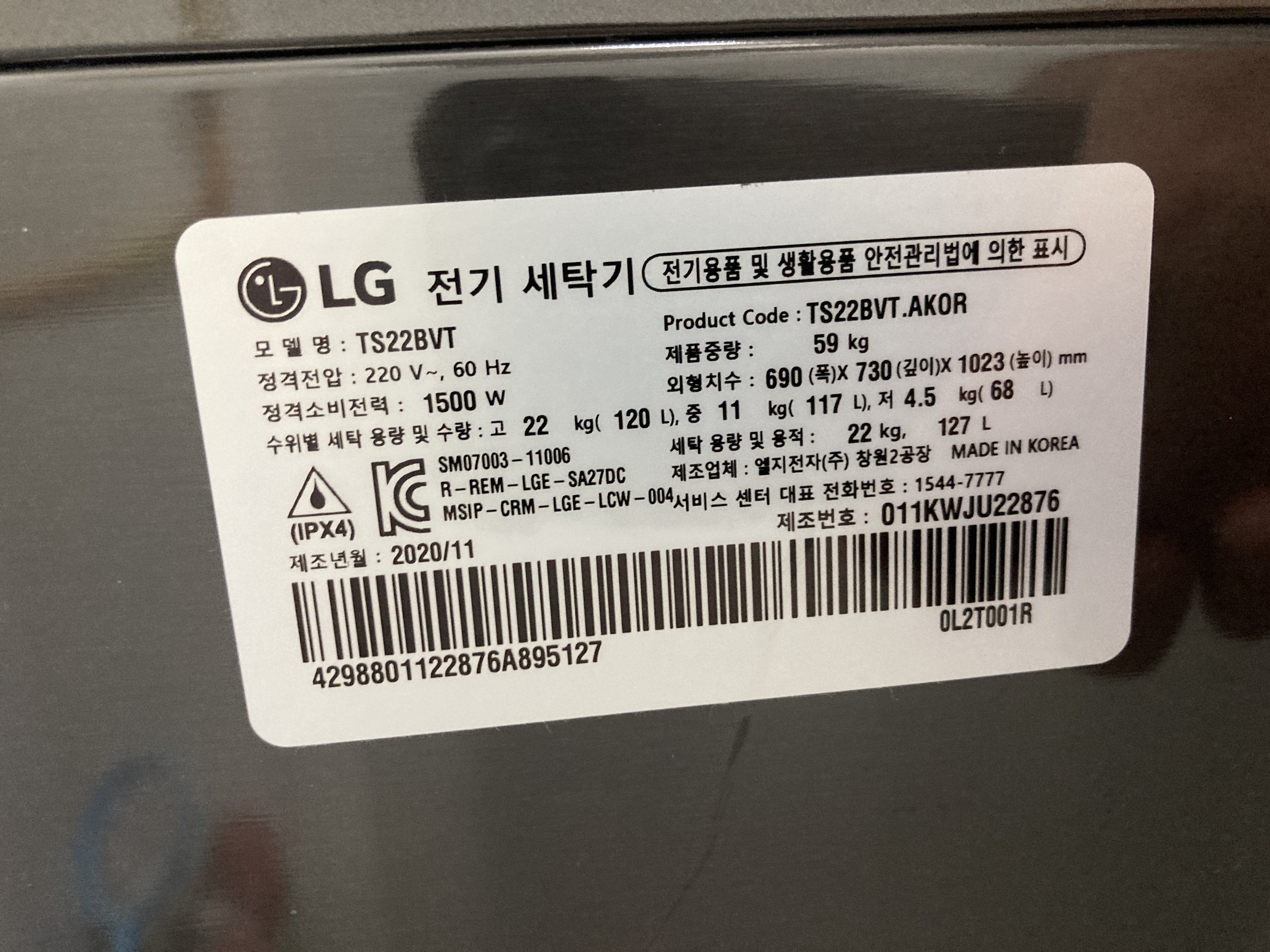 2020년 11월 10일에 구입한 LG 일반세탁기(통돌이) TS22BVT 모델.