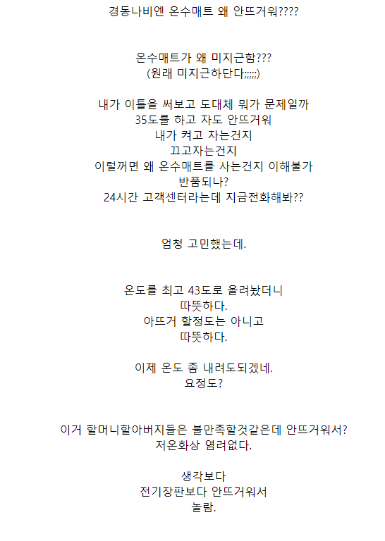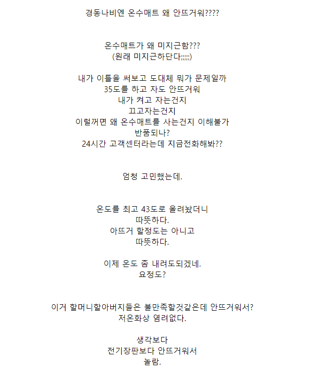 그런데 경동 온수매트가 등을 지지기에는 온도가 그리 뜨끈뜨끈하지 않다는 의견들이 꽤 보여서 구매하지 않기로 했다.