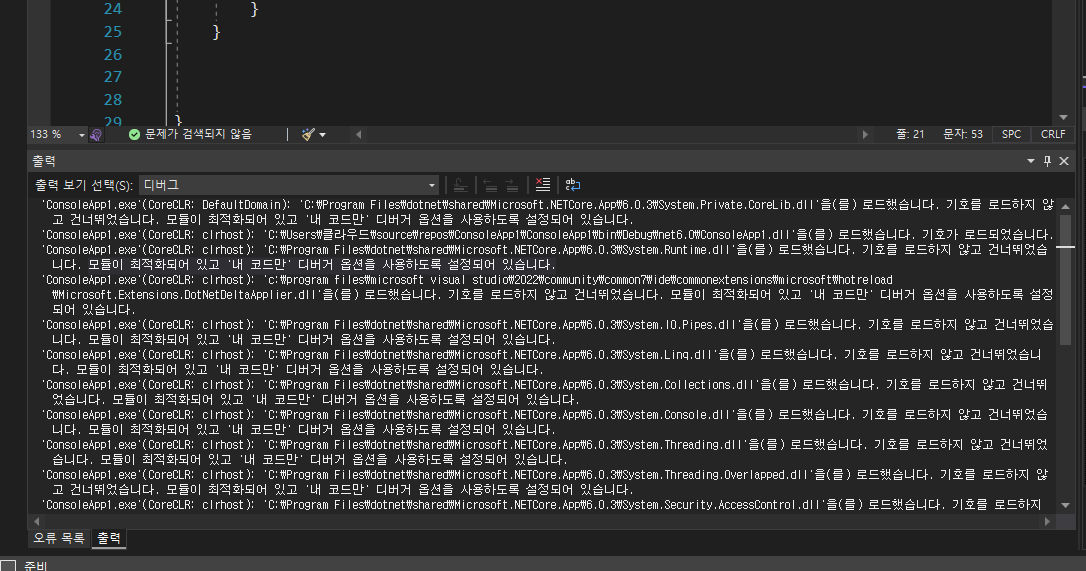 'C:\Program Files\dotnet\shared\Microsoft.NETCore.App\6.0.3\System.Console.dll'을(를) 로드했습니다. 기호를 로드하지 않고 건너뛰었습니다. 모듈이 최적화되어 있고 '내 코드만' 디버거 옵션을 사용하도록 설정되어 있습니다.