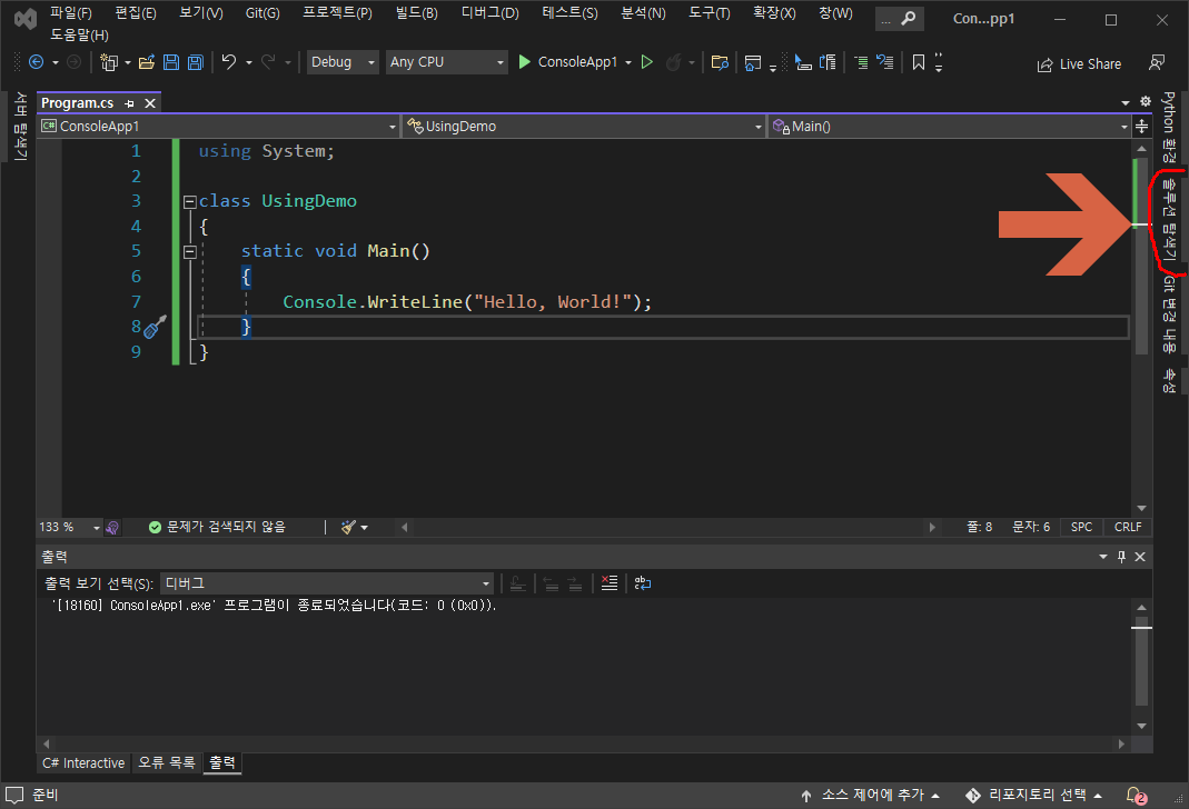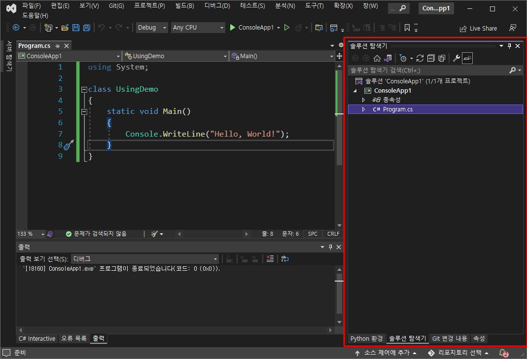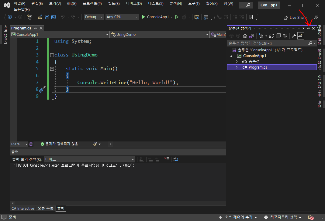 이럴 경우는 솔루션 탐색기를 띄우고 고정버튼(압정모양)을 눌러 고정시키면 우측 사이드바 형태로 다시 돌아온다.