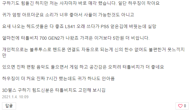 음질은 3D 잘 구현되고 괜찮다라는 DK 리뷰가 있었는데 문제점은 일단 귀가 아프다는 의견이 상당히 많았고, 그리고 김가루, 접착제 부분 떨어짐 등등의 내구성 문제가 꽤 많이 보였다.