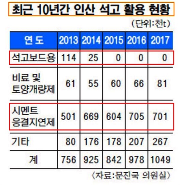 시멘트 공장들은 <추적 60분> 방송 이전인 2013년 51만 톤, 2014년 66만 9천 톤의 인산석고를 사용했다. 그런데 방송 이후인 2015년 60만 톤, 2016년 70만 5천 톤, 2017년 70만 톤으로 인산석고 사용량이 증가했다.