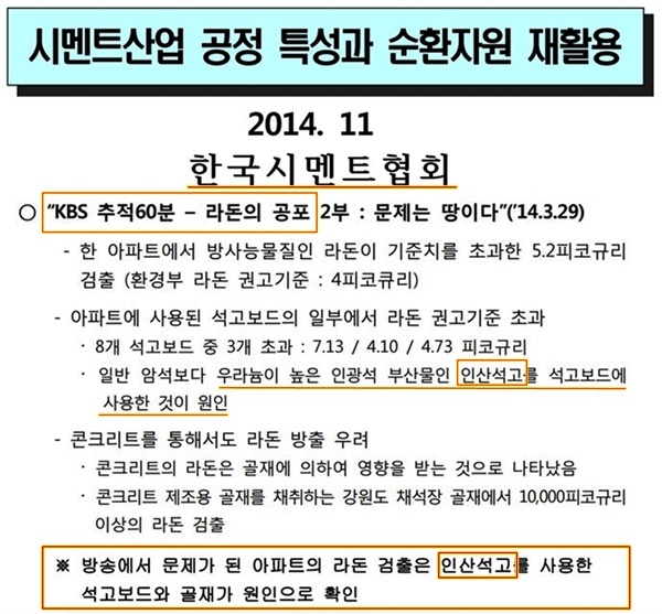 시멘트 기업들은 인산석고에 방사능 라돈이 함유되었다는 것을 모르는 걸까? 아니다. 한국시멘트협회가 <추적 60분> 방송 직후인 2014년 11월 만든 '시멘트산업 공정 특성과 순환자원 재활용'이라는 해명자료를 입수했다.