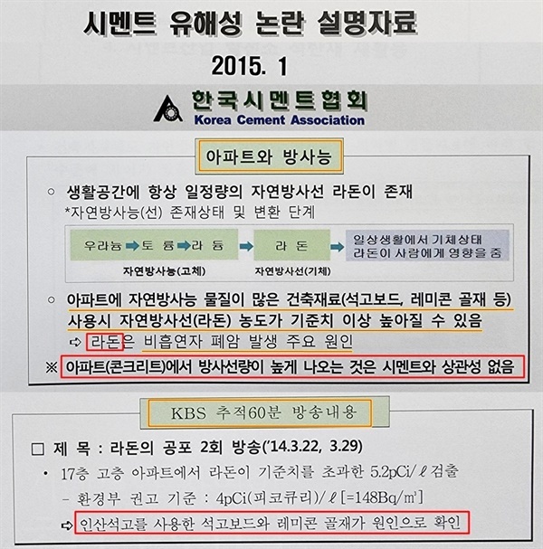 한국시멘트협회가 2015년 1월 제작한 '시멘트 유해성 논란 설명자료'라는 것도 입수했다. 한국시멘트협회는 이 설명자료 '아파트와 방사능'에서 '아파트(콘크리트)에서 방사선량이 높게 나오는 것은 시멘트와 상관성이 없다'며, 인산석고를 사용한 석고보드가 원인이라는 KBS <추적 60분> 방송내용을 자세히 소개했다.