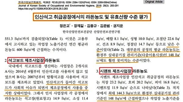 시멘트기업의 부도덕함은 한국산업안전공단의 '인산석고 취급공정에서의 라돈농도 및 유효선량 수준 평가'(2018)에서 쉽게 확인할 수 있다.