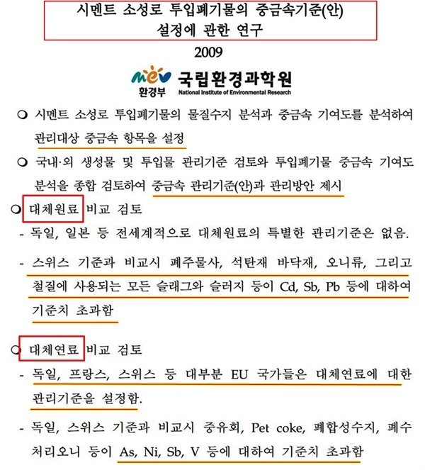 환경부 산하기관인 국립환경과학원은 2009년 '시멘트 소성로 투입폐기물의 중금속기준(안) 설정에 관한 연구'에서 시멘트 제조에 사용하는 쓰레기들이 독일, 프랑스, 스위스 등과 비교하여 Ni, Sb, V, Cd, Sb, Pb, As 등이 기준치를 초과함을 확인했다. 또 시멘트제품에 영향을 미치는 중금속 항목을 설정해야 한다고 강조했다.