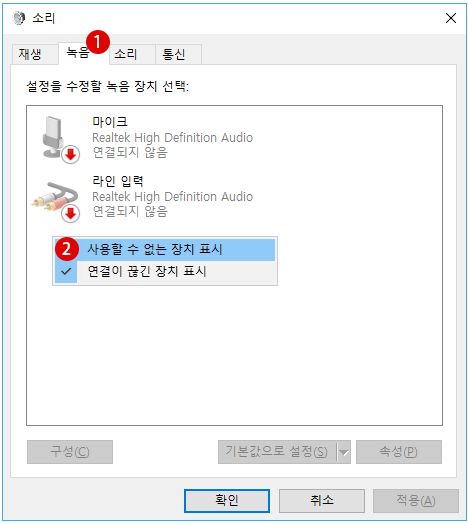 ▼ 이번에는 1녹음 탭을 선택합니다. 표시된 라인 입력 아래위 빈 공간에서, 마우스 오른쪽 클릭하고, 2사용할 수 없는 장치 표시를 클릭합니다.