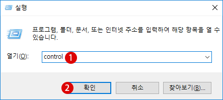 ▼ 아래와 같이  Windows + R키를 눌러 실행을 열고, 텍스트 입력란에 1control 또는 C:\Windows\System32\control.exe을 입력한 후, 2확인버튼을 클릭합니다.