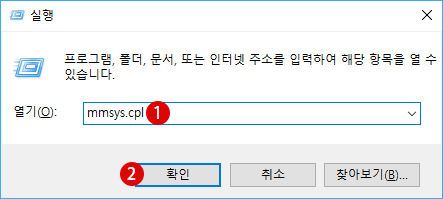 ▼ 또는 Windows + R키를 눌러 아래와 같이, 실행 툴을 실행합니다. 텍스트 입력란에 1mmsys.cpl를 입력하고, 2확인 버튼을 클릭합니다.
