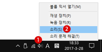 ▼ 또는 간단한 방법으로, 알림 영역의 1 스피커 아이콘에서 마우스 오른쪽 클릭한 후, 2소리(S)를 클릭하면 소리 속성 창이 열립니다.