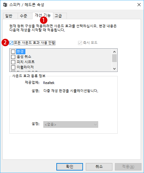 ▼ 스피커/헤드폰 속성 창이 열립니다. 1개선 기능 탭을 선택하고, 2모든 사운드 효과를 사용 안함에 체크합니다.