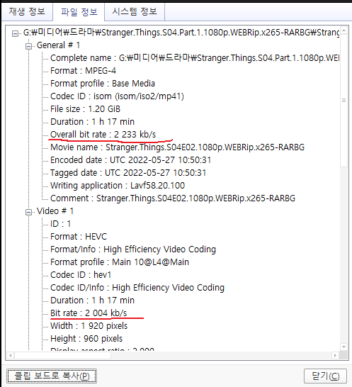 오디오는 위에 언급한 대로 원본영상의 재생정보에서 오디오 비트레이트를 확인하고