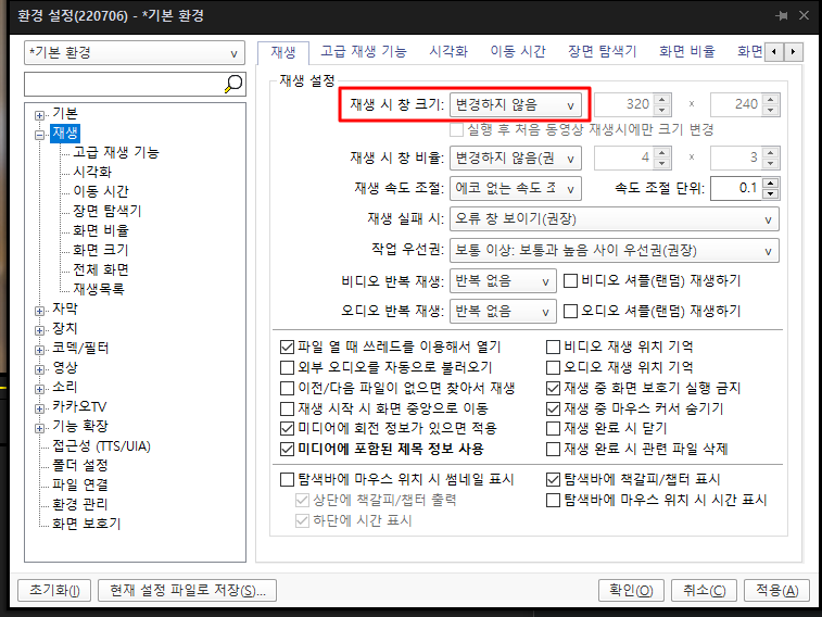 그리고 '기본 / 재생기 실행시'에서 창 크기를 '이전 크기'로 해놓아야 한다.