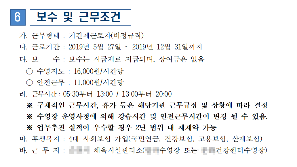 아래는 어느 지자체 수영강사 채용공고 및 어느 지역 체육시설강사관리 규정이다.