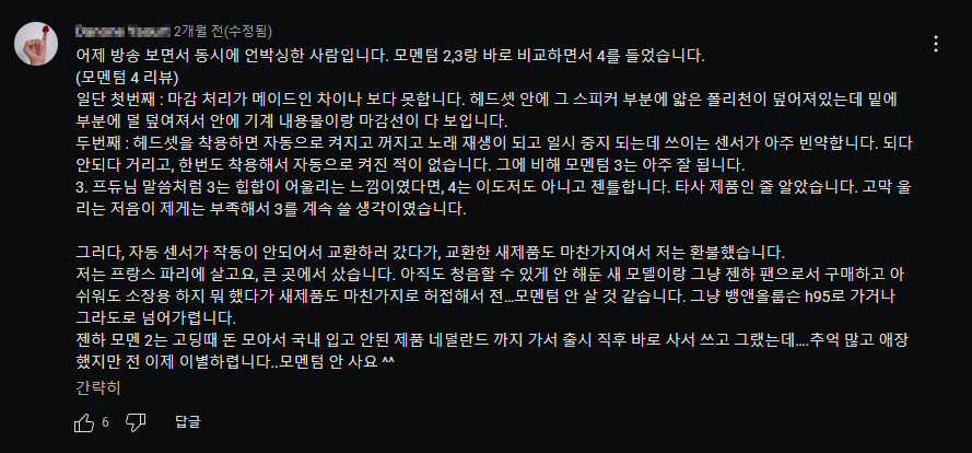 젠하이저 모멘텀4 블루투스 헤드폰이 할인으로 풀렸는데, 의외로 인기가 크지 않은 것 같아서 그 원인을 이리 저리 검색해 봤는데, 유튜브 관련 동영상에 아래와 같은 댓글이 달렸다.
