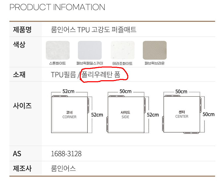 하지만 TPU 퍼즐매트라고 판매하는 다른 업체의 제품들도 대부분 폴리우레탄이 메인 재료인 듯 했다.