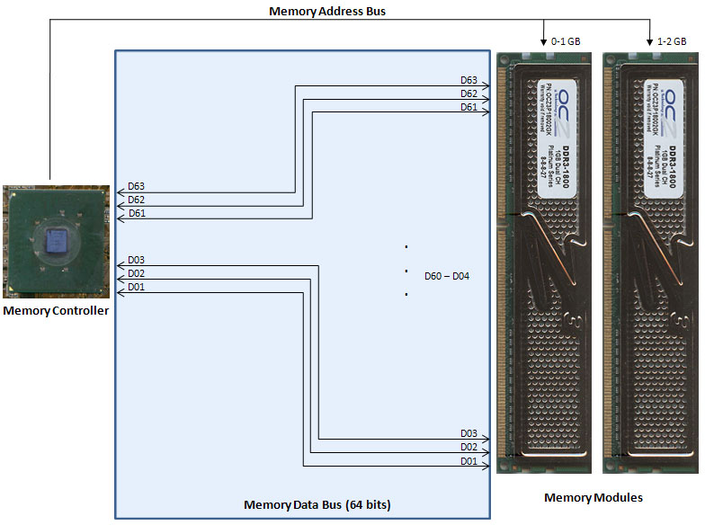RAM은 CPU의 메모리 컨트롤러를 통해 CPU와 통신합니다. 대부분의 최신 마더보드에는 CPU와 메모리 사이에 두 개의 64-bit (총 128-bit) 채널이 있습니다. 단일 채널 구성에서는 그중 하나만 작동합니다. 이것은 메모리 처리량을 설치된 가장 느린 단일 RAM 모듈의 정격 속도로 제한합니다.