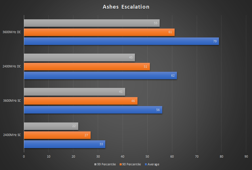 Ashes Escalation도 비슷한 결과를 보여줍니다. 이 게임은 더 느린 단일 채널 구성으로는 플레이할 수 없지만 더 빠른 메모리 모듈이나 저렴한 듀얼 채널 키트로 전환하면 됩니다. 다시 한번, 저렴한 듀얼 채널 구성이 값비싼 단일 채널 3600MHz 모듈보다 낫습니다.