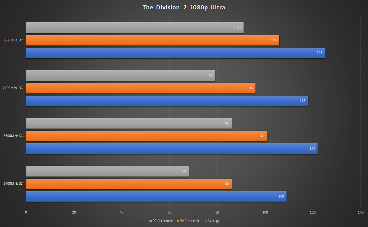 Division 2와 Metro Exodus는 약간 다르게 작동합니다. 두 게임 모두 2400MHz 듀얼에 비해 3600MHz 단일 채널 메모리 구성을 사용하여 더 잘 수행됩니다. 그럼에도 불구하고 3600MHz 단일 채널과 2400MHz 듀얼 채널 메모리의 차이는 기껏해야 미미합니다. 이것은 훨씬 더 비싼 3600MHz 단일 채널 모듈보다 3200MHz 듀얼 채널 구성을 선택하는 것이 더 낫다는 것을 증명합니다.