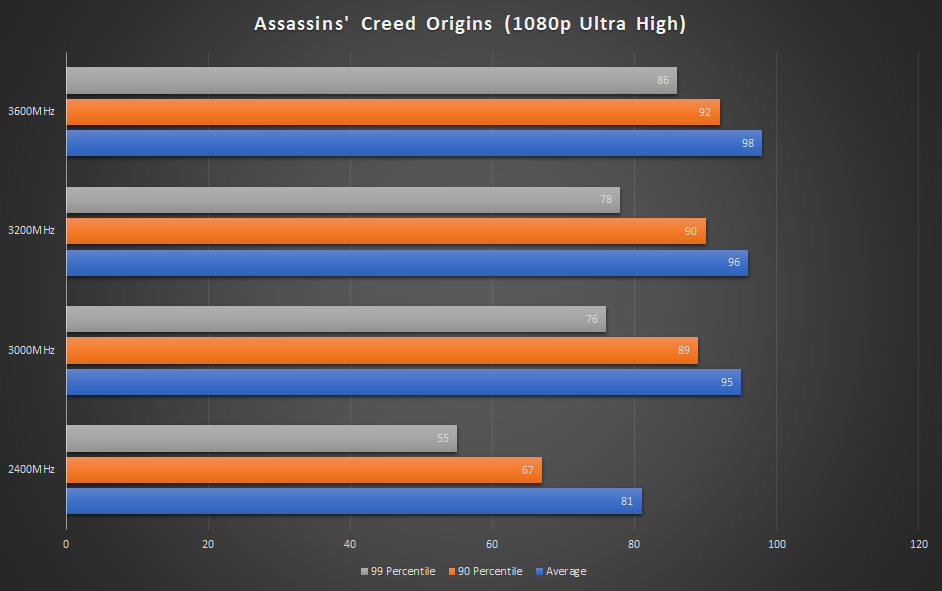 예상했던 대로, 2400MHz의 단일 채널 구성을 사용할 경우 Assassins’Creed는 정말 짜릿한 긴장감을 자아냅니다. 강력한 3900X조차도 Origins에서 1080p에서 평균 60FPS (RTX 2080Ti 사용)를 달성할 수 없습니다. 듀얼 채널 구성으로 전환하면 최젓값이 두 배 이상 증가하며 평균을 80 FPS 이상을 달성합니다. 흥미롭게도 듀얼 채널 2400MHz 키트가 단일 채널 3600MHz 구성보다 낫습니다.