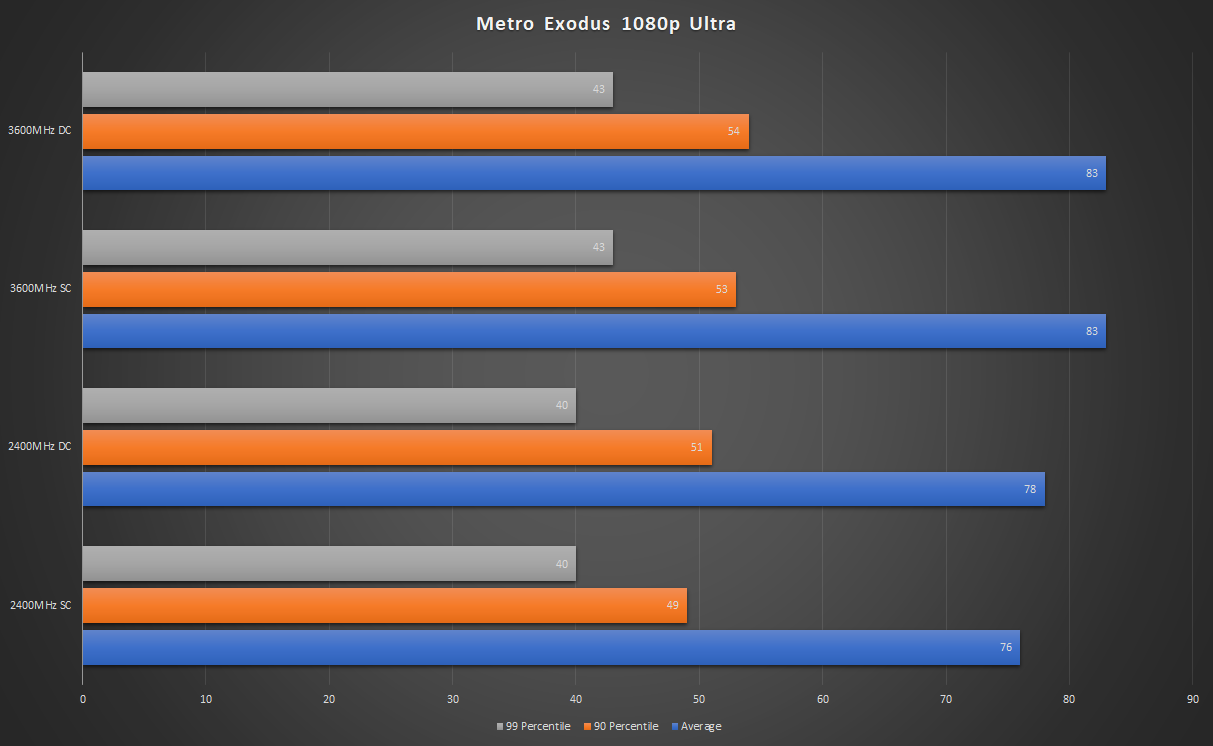 Division 2와 Metro Exodus는 약간 다르게 작동합니다. 두 게임 모두 2400MHz 듀얼에 비해 3600MHz 단일 채널 메모리 구성을 사용하여 더 잘 수행됩니다. 그럼에도 불구하고 3600MHz 단일 채널과 2400MHz 듀얼 채널 메모리의 차이는 기껏해야 미미합니다. 이것은 훨씬 더 비싼 3600MHz 단일 채널 모듈보다 3200MHz 듀얼 채널 구성을 선택하는 것이 더 낫다는 것을 증명합니다.