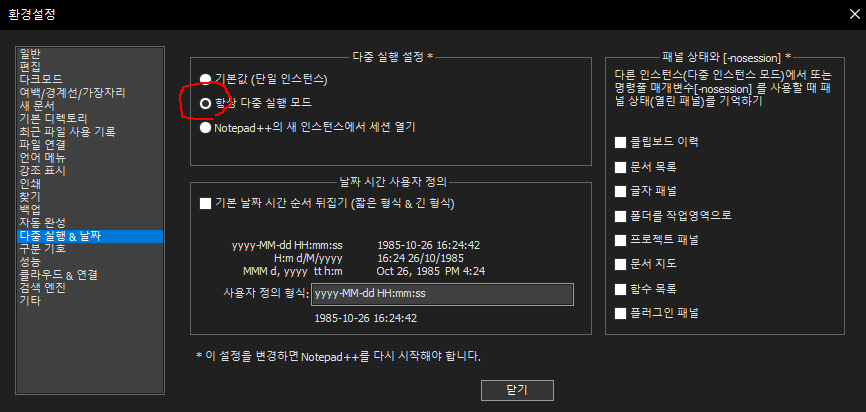 기본값은 단일 창에서 여러 탭으로 새 파일을 열게 되어 있다.이를 위의 환경설정에서 다중실행 탭에서 "항상 다중 실행 모드"로 변경하면 그 다음부터 각각 새 창으로 열리게 된다.