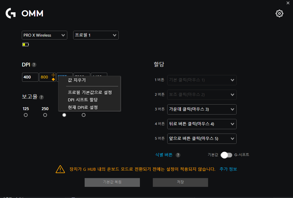 DPI 시프트 할당을 선택하면 그 칸의 DPI로 바뀐다.