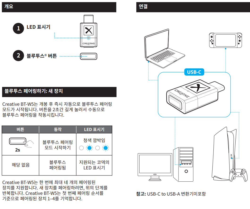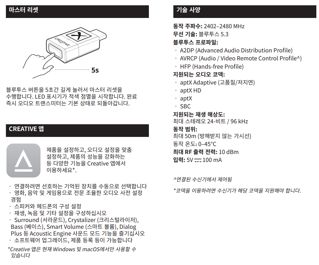 오디오 쪽으로 잘 알지는 못하지만 BT-W4에서의 안정성 문제가 개선되고 96khz까지 음질이 상향되어 나온 모델이 BT-W5라고 한다. 하지만 가격은 비슷한데 BT-W4에 있던 USB-A 젠더가 빠지고 아날로그 마이크 슬롯에 꽂을 수 있던 부품이 빠졌기 때문에 약간 이전 멀티미디어 기기를 더이상 지원하지 않겠다는 Creative社의 굳은 의지가 엿보였다.