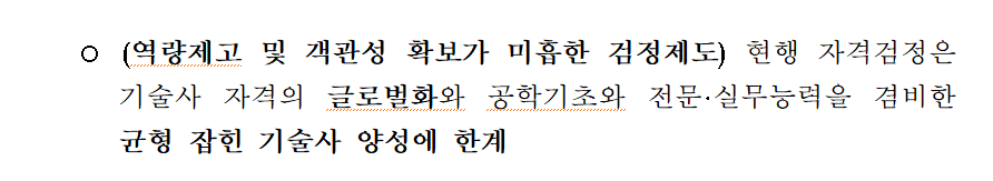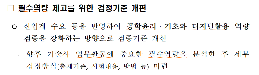 기술사 검정제도에 대해선 '객관성 확보가 미흡'하다고 지적을 한 부분이 있길래 혹시 서술형 문항이나 면접시험같은 '주관적인 채점 또는 채점 비리'의 개연성이 있을 수 밖에 없는 요소를 없애기라도 할 것인지 궁금해서 자세히 보니...