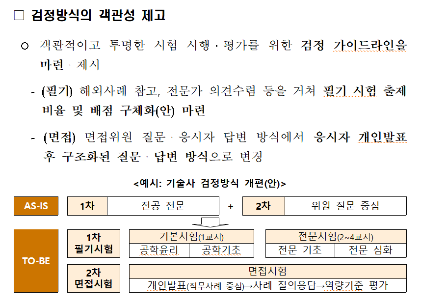 기술사 검정제도에 대해선 '객관성 확보가 미흡'하다고 지적을 한 부분이 있길래 혹시 서술형 문항이나 면접시험같은 '주관적인 채점 또는 채점 비리'의 개연성이 있을 수 밖에 없는 요소를 없애기라도 할 것인지 궁금해서 자세히 보니...