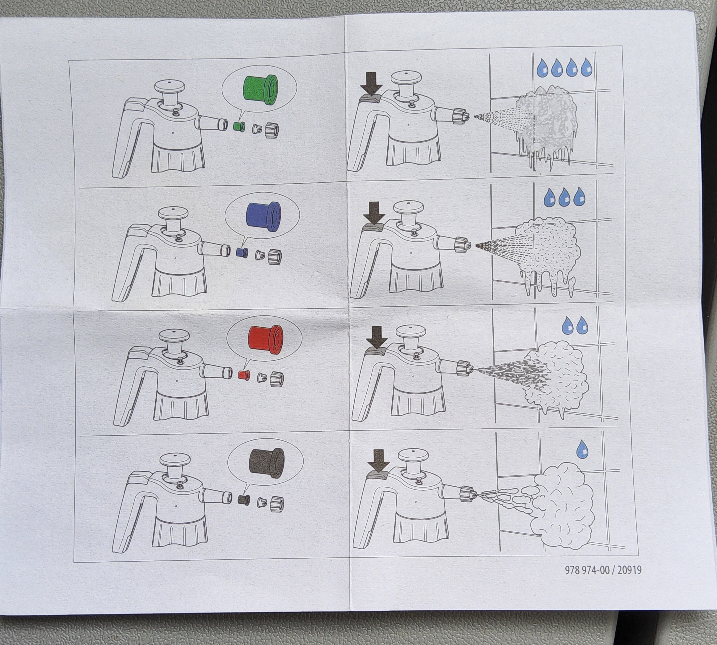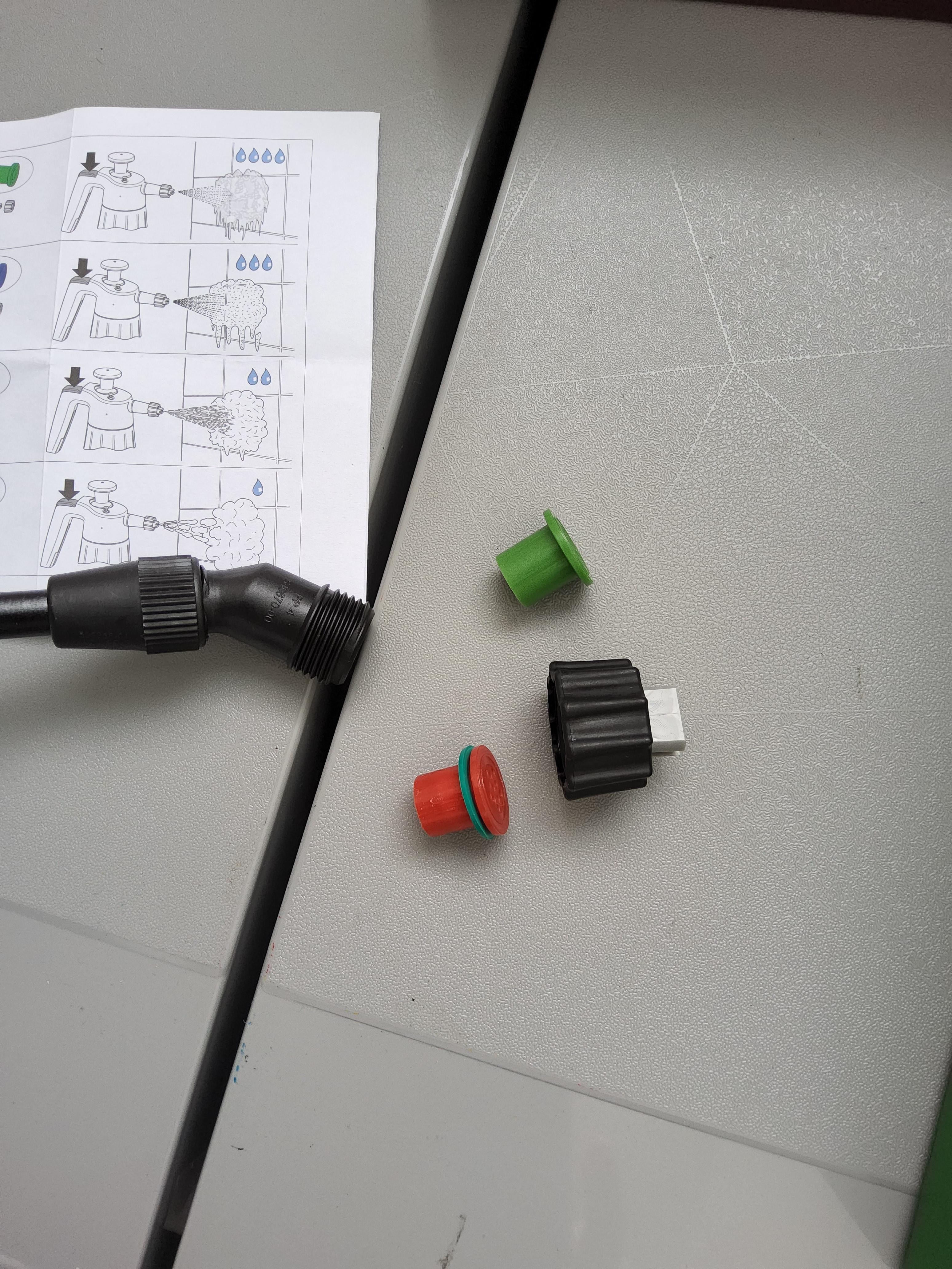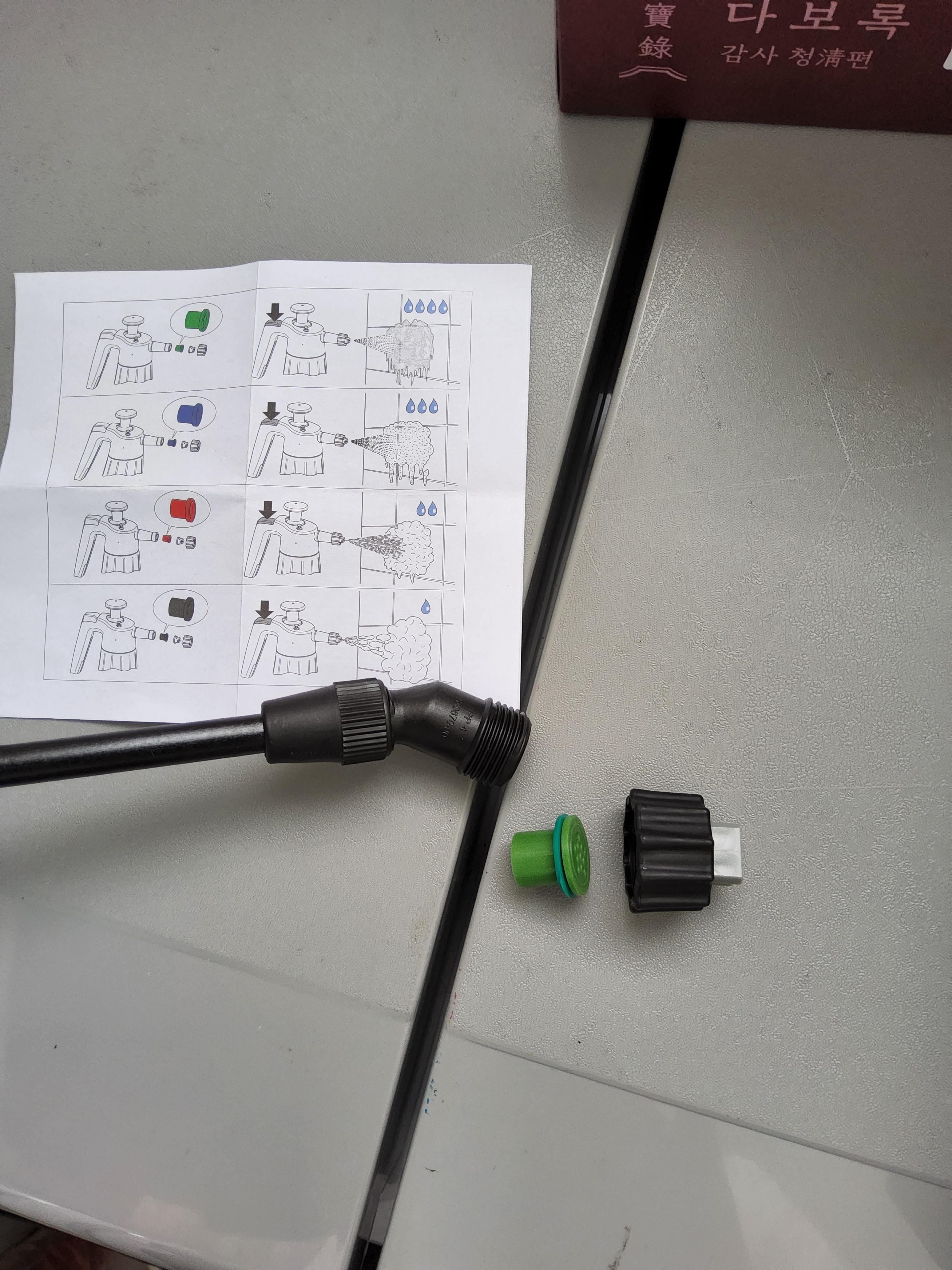 노즐을 교체할 때는 제일 아래의 사진을 보면 참고가 되는데 고무와샤(녹색, 오링?)를 빼먹지 말고 새 노즐에 옮겨 끼워야 한다.