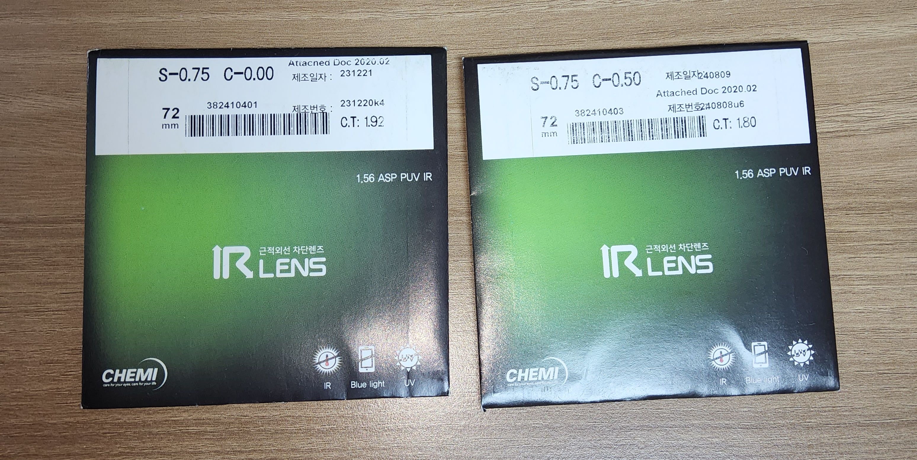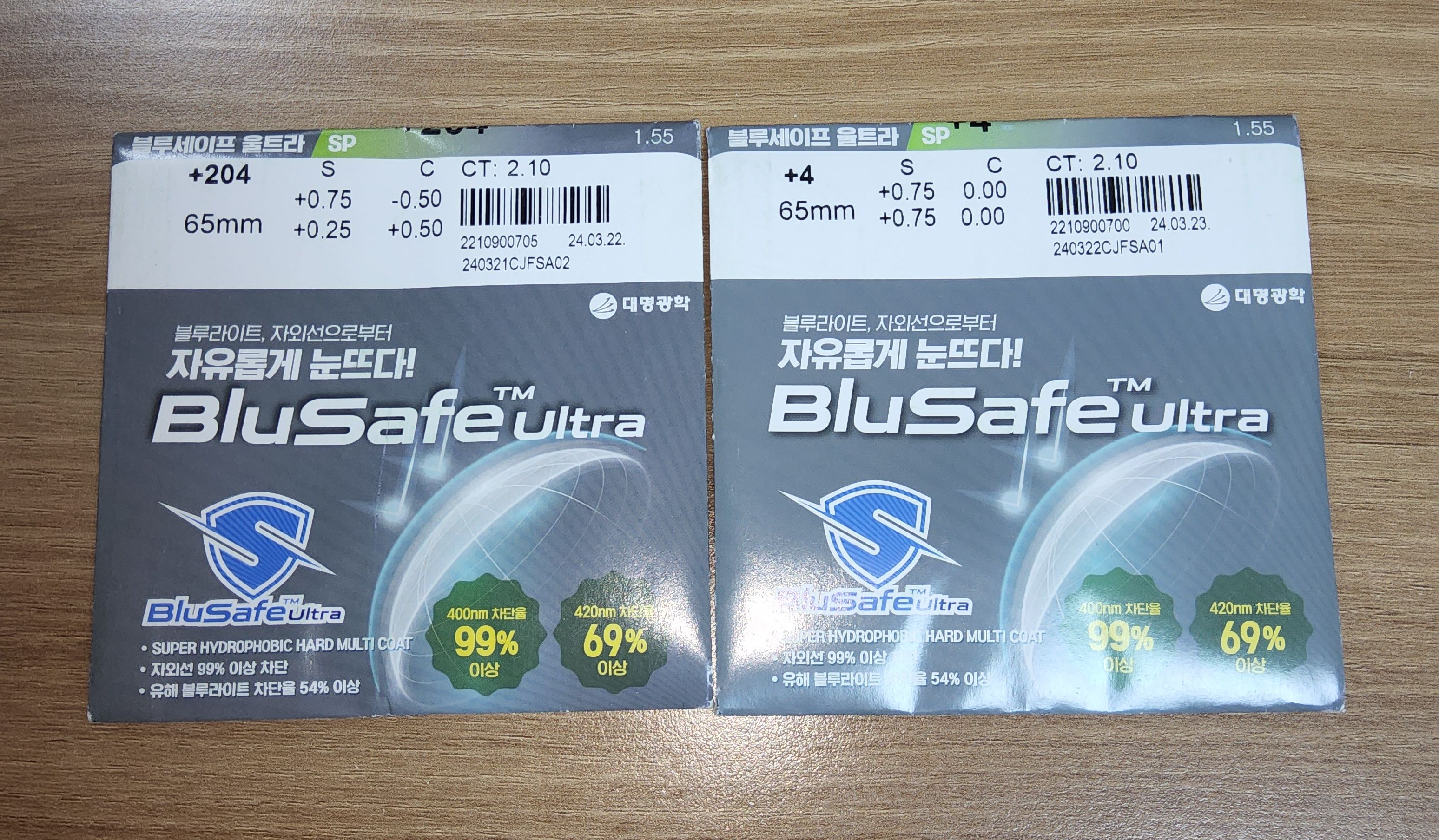 내 얘기를 듣고는 즉석에서 도움이 되는 옵션(?)들을 추가해서 제시했는데 더 눈이 편안해지는 느낌이 들어 안경 두개를 새로 맞췄다. 운전용 안경은 UV는 물론 근적외선까지 차단되는 케미 IR렌즈로 맞췄고 독서용 안경은 케미 퍼펙트UV차단 렌즈를 원했는데 나온지 너무 오래되었고 재고가 없었는지 대명광학 블루세이프 울트라 렌즈로 제작해줬다.