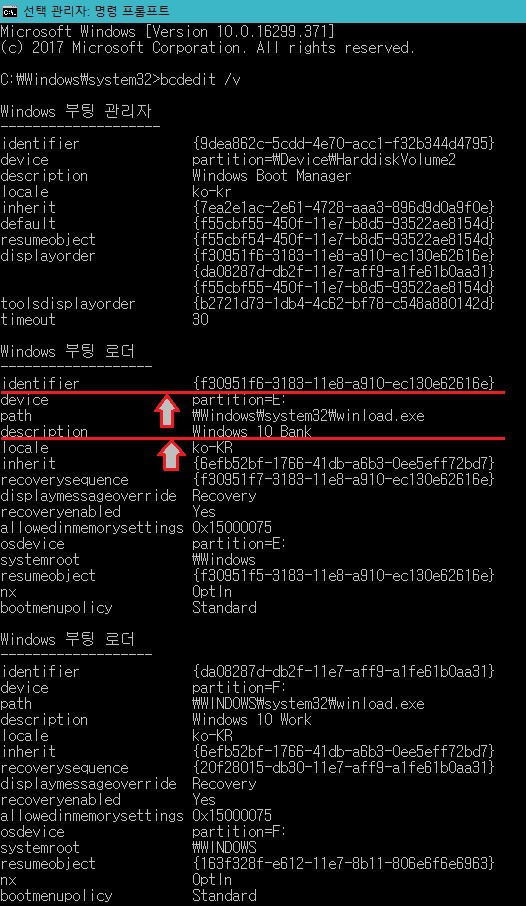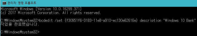 식별자가 {f30951f6-3183-11e8-a910-ec130e62616e} 인 부팅의 이름(description)을 Windows 10 Bank로 바꾸라는 명령이다. 이때 중요한 것은 식별자와 description 사이에 반드시 한칸이 띄어져 있어야 한다는 점이다.