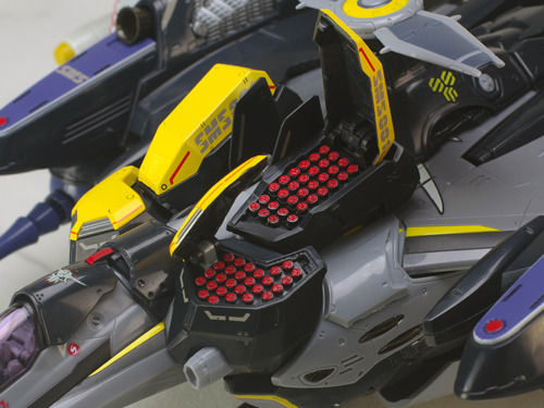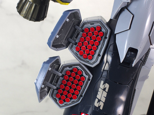가슴의 미사일 해치와 미사일은 교체할 수 있으며 외부 또는 내부로 열 수 있습니다.