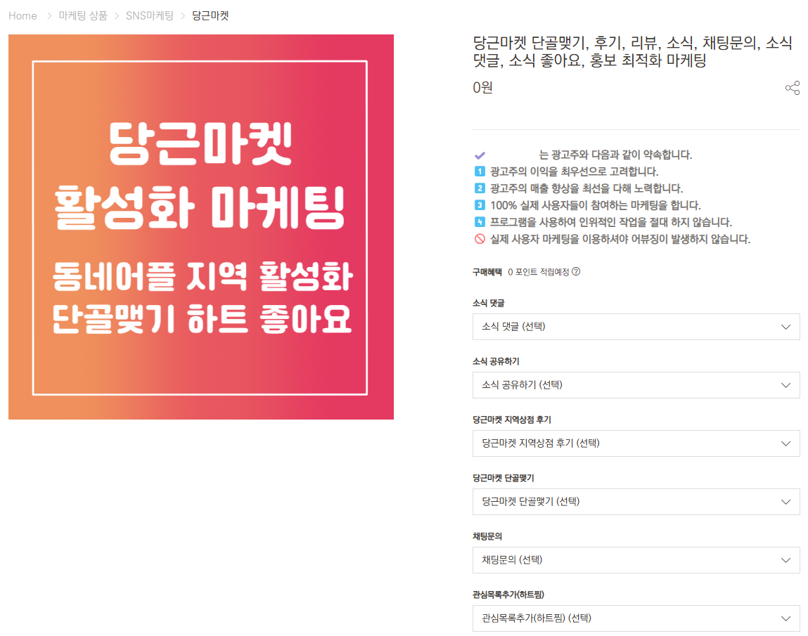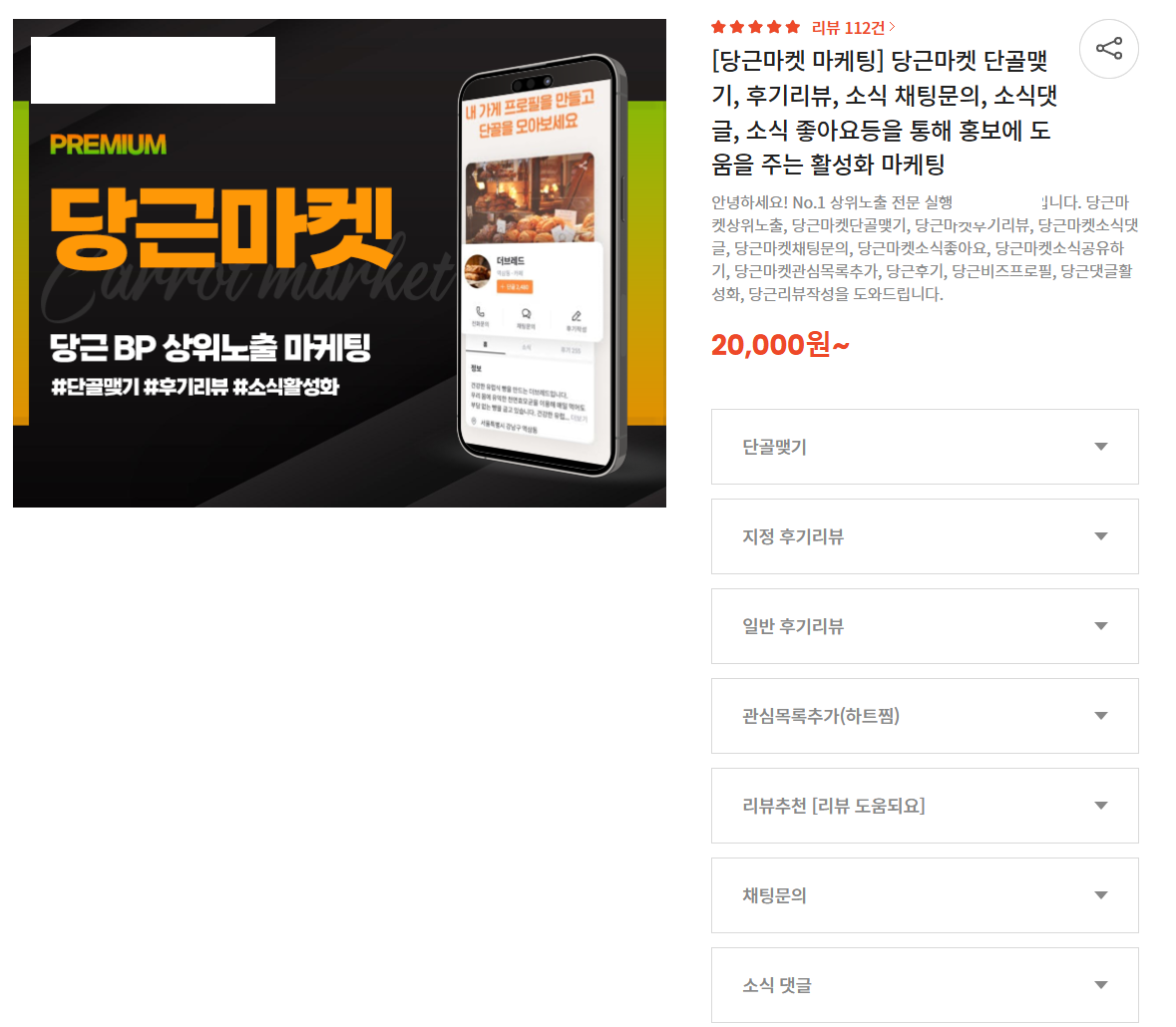 아래는 당근의 동네업체 단골, 리뷰, 댓글, 하트 수 등을 올려주고 돈을 받는 서비스를 하는 업체들의 판매페이지를 캡쳐한 것이다. 이것만 봐도 당근 동네업체를 왜 믿으면 안되는지를 알 수 있다.