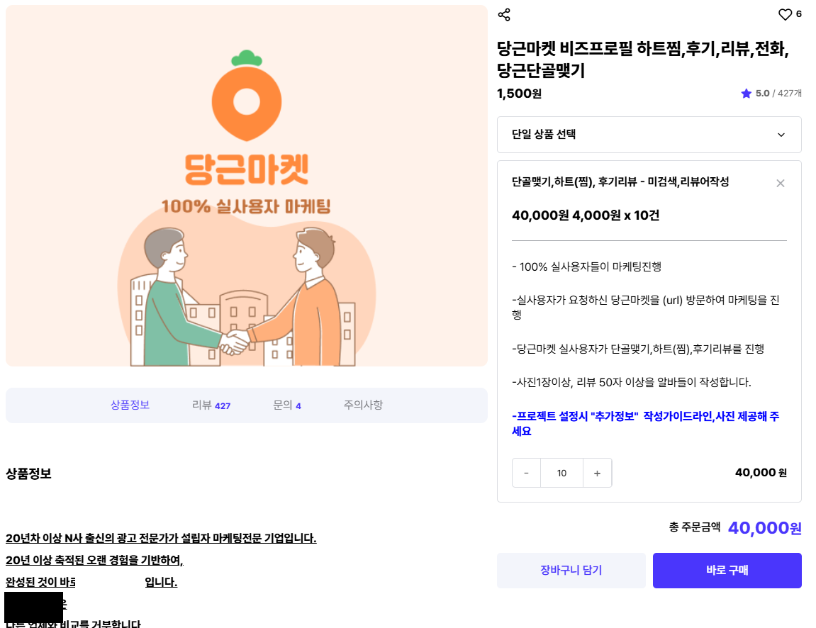 아래는 당근의 동네업체 단골, 리뷰, 댓글, 하트 수 등을 올려주고 돈을 받는 서비스를 하는 업체들의 판매페이지를 캡쳐한 것이다. 이것만 봐도 당근 동네업체를 왜 믿으면 안되는지를 알 수 있다.