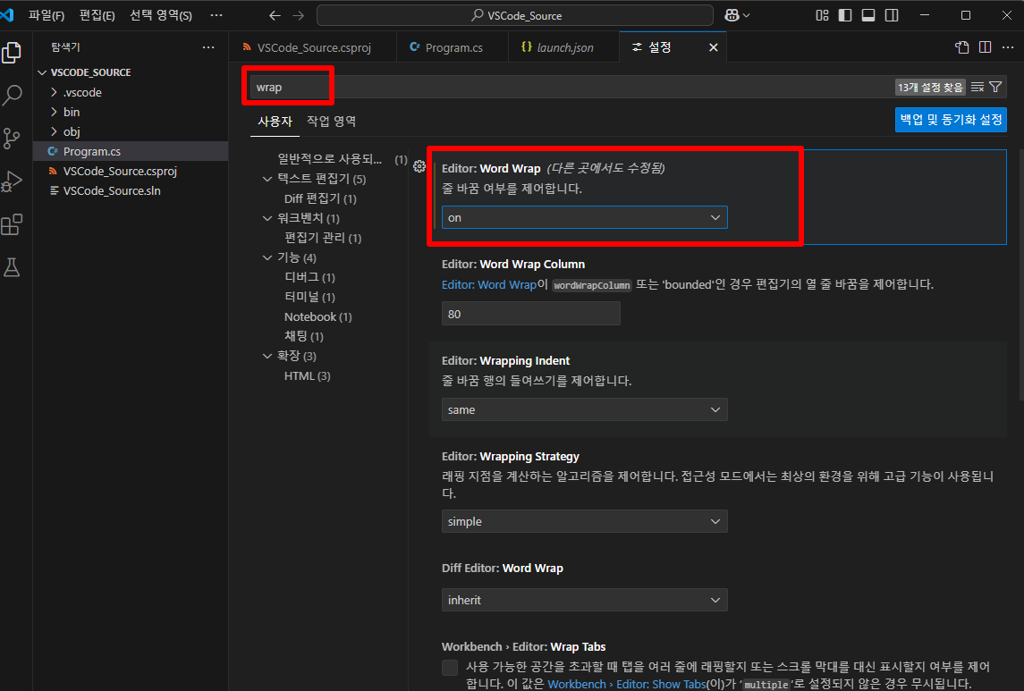 그리고 'wrap'을 검색하면 Editor:Word Wrap 이 나오는데 그걸 On 시키면 된다.