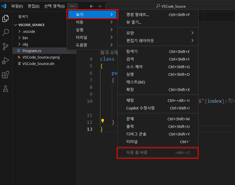 비주얼 스튜디오 코드에서 '자동줄바꿈'을 하려면 어떻게 해야 할까.