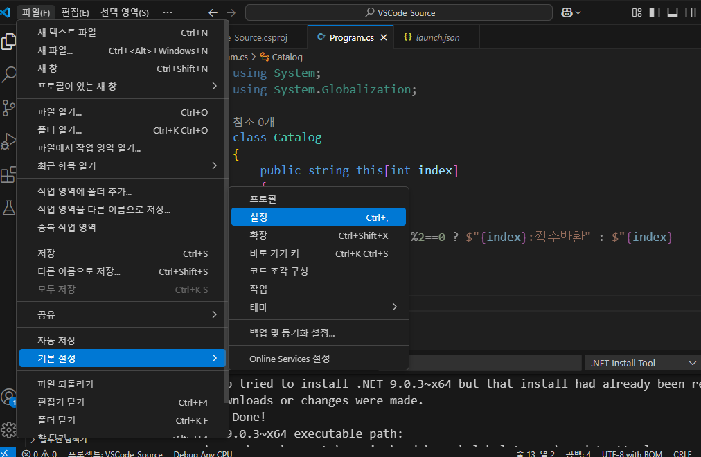 아니면 '파일'메뉴에서 아래쪽에 '기본 설정' / '설정' 으로 들어갈 수 있다.