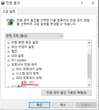 최대 프로세서 설정은 '고급 전원 관리 옵션'으로 들어가야 한다.