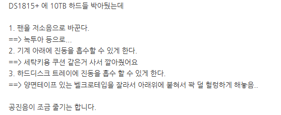 시놀로지 NAS는 텅텅거리는 소리로 유명하다. HDD의 진동이 NAS의 베이 어디쯔음을 통해 텅텅거리는 소리로 증폭 또는 변질되어 사용자에게 전달되는 것인데 인터넷을 찾아보니 이를 해결하려는 노력들이 보여 백업해 둔다.