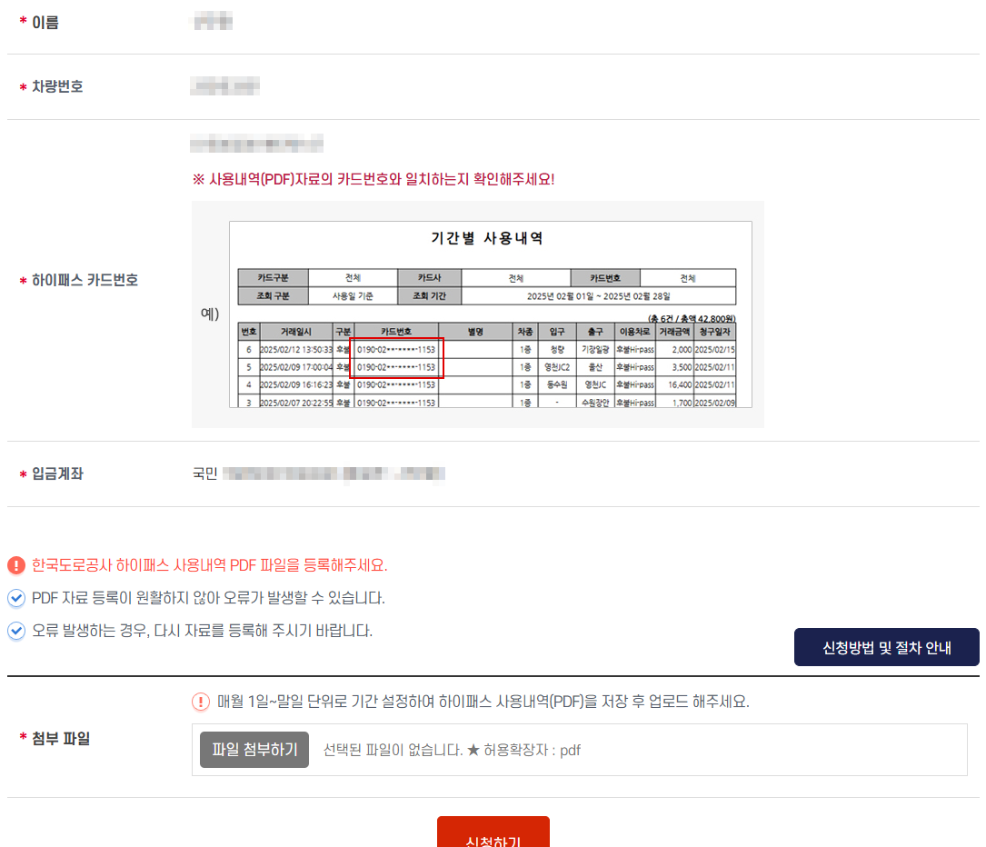 아래에 첨부파일에 아까 하이패스에서 만든 사용내역 PDF파일을 첨부해서 "신청하기" 버튼을 누른다.