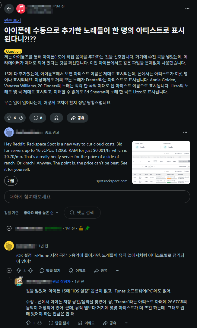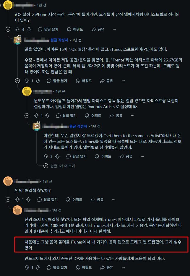 아이튠즈, 수동으로 추가한 음악들이 한 명의 아티스트로 표시?
