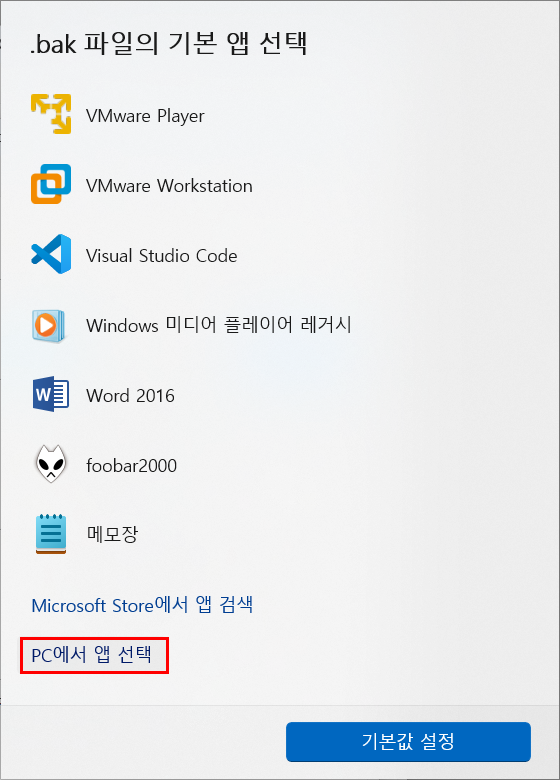 한컴오피스 등 설치 후 bak 확장자를 가진 파일의 아이콘이 한컴으로 바뀌어 곤란해하는 경우가 있다.